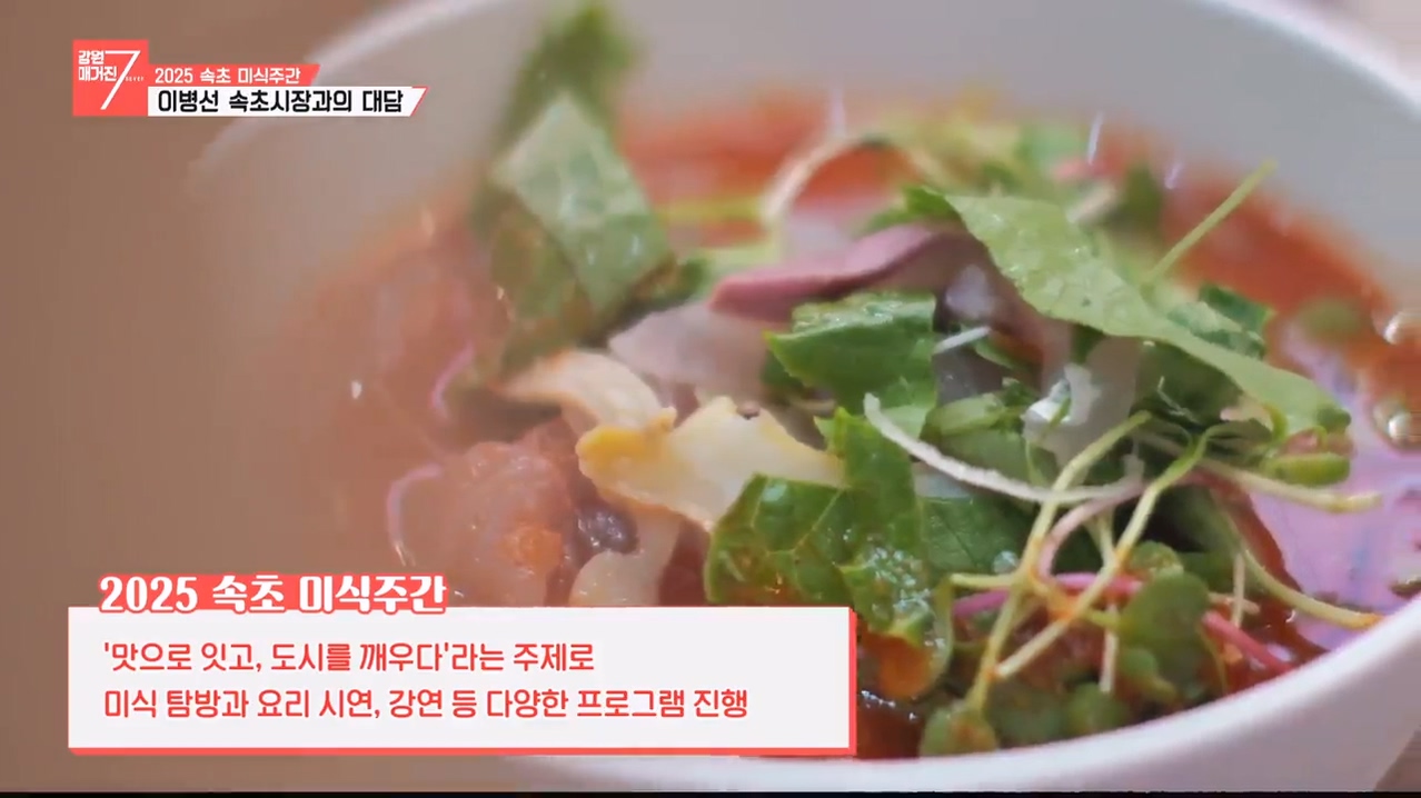 ♣ 2025 속초 미식주간 – 이병선 속초시장과의 대담 속초의 맛을 다각도로 뽐내는 <2025 속초 미식주간>. '맛으로 잇고, 도시를 깨우다'라는 주제 아래 속초 고유의 식문화와 지역 정체성을 결합해 도시 곳곳을 미식의 무대로 꾸몄는데... 푸른 속초 바다를 배경으로 이병선 속초시장과 김재희 리포터를 초대해 <2025 속초 미식주간>에 대한 이야기를 나눠본다. ♣ 2025 속초 미식주간 – 스토리가 담긴 속초 맛 기행! 리포터와 속초의 맛 칼럼리스트가 함께 지역의 대표 음식을 찾아다니는 로컬 미식 로드! 속초의 맛과 사람, 그리고 정취를 따뜻하게 담는 여정으로, 단순한 맛집 소개를 넘어 ‘왜 이 음식이 속초의 맛인가’를 사람들의 이야기, 손맛을 통해 소개한다. ① 은혜오징어순대(경기도은혜횟집) 주 소: 속초시 중앙로147번길 16 속초중앙시장 회센터 159호 전 화: 033-637-0744 ② 함흥냉면옥 주 소: 속초시 금호동 482-150 전 화: 033-633-2256 ③ 감자바우 주 소: 속초시 청초호반로 242 감자바우 전 화: 033-632-0734 ♣ 2025 속초 미식주간 – 몸소 느끼는 미식! 속초 바다와 산, 그리고 사람들의 손끝에서 피어나는 맛의 여행! ‘맛으로 잇고 도시를 깨우다’란 주제로 열린 <2025 속초미식주간>. 미식은 ‘좋은 음식’, 또는 ‘좋은 음식을 맛봄’을 뜻한다. 하지만 맛은 오직 입으로만 느끼는 걸까? 손으로도 느끼고, 향으로도 느끼고, 눈으로도 느끼는 속초의 미식! 시민들이 몸소 미식을 느껴보는 현장을 담아본다. ♣ 2025 속초 미식주간 – 속초의 맛, 문화를 잇다 속초 곳곳에서 진행되는 문화와 맛이 어우러진 다양한 이벤트들. 지역의 문화를 알리는 로컬 크리에이터의 특별한 만남부터 전시, 마켓, 맛과 음식이 함께하는 특별한 영화제, 속초국제음식영화제 개막식 현장까지 만나본다.