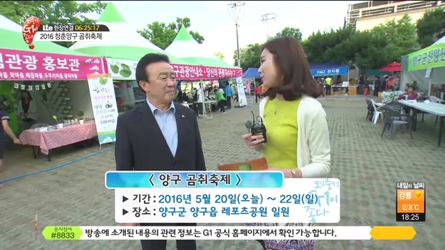 <함께하니 더 맛있다! 이색궁합 맛집~♪> 누구에게나 환상의 짝이 있듯이! 맛있는 음식에도 천생연분은 존재하는 법! 첫 번째로, 사과를 듬~뿍 넣은 달콤한 숯불고기와 백반 혹은 냉면, 소면의 찰떡궁합! 두 번째는 어울리는 듯~ 안 어울리는 듯! 그러나 함께해서 더 맛있는 이색짬뽕과 피자의 환상의 만남!까지 만나보자. ① 숯불고기 스페셜 <옥동숯불고기백반> 주 소 : 강원도 횡성군 횡성읍 옥동리 255-2 연락처 : 033)343-4140 ② 이색 짬뽕+피자 세트 <뽕쟁이> 주 소 : 강원도 강릉시 성내동 7-1 연락처 : 033)648-3332 --------------------------------------------------- <2016 강원아트페어 & 강원도 유기농데이> 고품격 예술축제 '제12회 강원아트페어'가 '강원의 美-더 가까이'를 주제로 개막한다! 춘천-원주-강릉에서 진행되는 강원아트페어, 예술 시장의 이야기를 카메에 담았다. 그리고, 서울 고척돔에서 강원도의 청정 농산물을 알리고 평창동계올림픽 붐 조성을 위한 넥센 히어로즈와 함께하는 '유기농데이'가 열린다! 그 뜨거운 현장, 함께하자. * 제12회 강원아트페어 ‘강원의 美 - 더 가까이’ 일정 : ~ 6월 6일(월)까지 장소 : 춘천문화예술회관 * 제12회 강원아트페어 ‘강원의 美 - 더 가까이’ 일정 : 6월 3일(오늘) ~ 6월 8일(수) 장소 : 원주치악예술관 * 제12회 강원아트페어 ‘강원의 美 - 더 가까이’ 일정 : 6월 22일(수) ~ 6월 28일(화)까지 장소 : 강릉시립미술관 --------------------------------------------------- <초여름 맞춤 여행지! 오감만족 '속초'> 하루가 다르게 점점 더워지는 날씨! 눈앞으로 다가온 여름이 걱정된다면! 오늘의 초여름 맞춤 여행지를 주목! 영랑호의 매력을 물씬 느낄 수 있는 스토리바이크와 세그웨이체험, 카누체험과 더위를 한 번에 날려버릴 '오징어 맨손잡기'체험까지! 속초에서 보내는 잊지 못한 여름의 추억을 만들어보자. ① 스토리바이크 장소 : 강원도 속초시 금호동 610-28 연락처 : 033)637-7009 ② 세그웨이체험(왕발통) 장소 : 강원도 속초시 금호동 600-7 연락처 : 033)637-9854 033.637.9854 ③ 영랑호 카누 장소 : 강원도 속초시 금호동 600-7 영랑호 카누경기장 연락처 :033)63502553 ④ 장사 어촌체험마을 장소 : 강원도 속초시 장사항해안길 58 연락처 : 033)632-9796 --------------------------------------------------- <신이 머무는 동네, 원주 성황림마을> 천연기념물 제93호인 성황림과 국내 유일의 온대 낙엽활엽수림을 갖고 있는 원주 성황림마을! 때 묻지 않은 순수의 자연을 터전 삼아 살아가는 원주 심림면 성남2리, 성황림 마을 이웃들을 찾아간다. 한 해 농사로 분주한 들녘부터, 체험객들을 위한 공간을 가꾸는 일까지! 김피디와 하루가 빠듯할 정도로 분주한 성황림마을로 가보자.