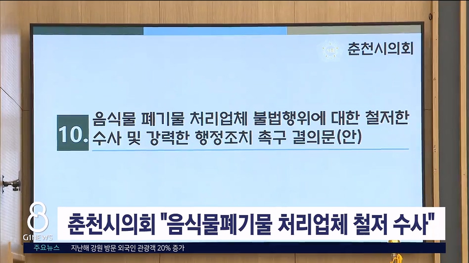 G1뉴스가 보도한 춘천 한 음식물 폐기물 처리업체의 불법행위 의혹과 관련해, 춘천시의회가 철저한 수사와 강력한 행정조치를 촉구했습니다.