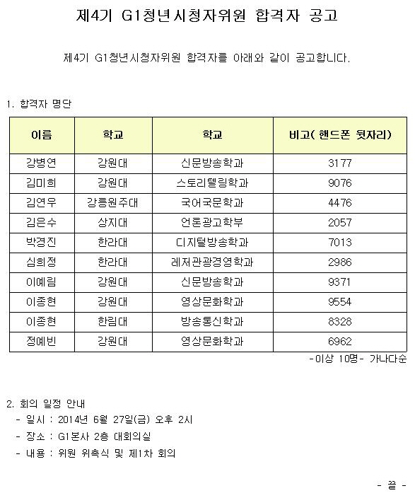 제4기 청년시청자위원 합격자 공고 작성자 :관리자 등록일 :2014-07-02 조회수 :3,708 이전글G1강원민방 시청자 소감문 공모결과2014-09-25다음글제4기 청년시청자위원 합격자 발표 안내2014-06-13 목록