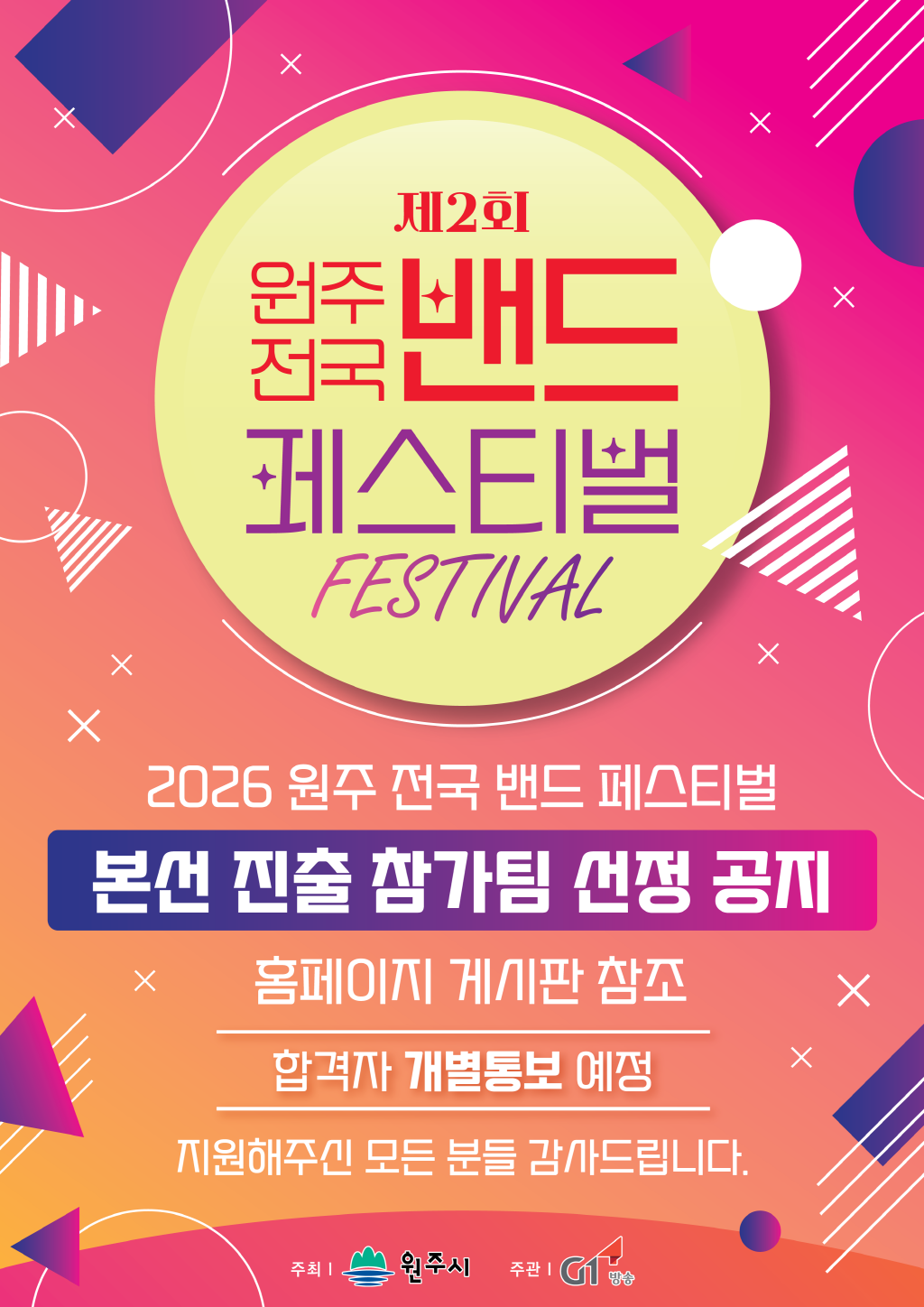 2026 원주 전국 밴드 페스티벌 본선 진출 명단 작성자 :관리자 등록일 :2026-02-11 조회수 :818 2026 원주 전국 밴드 페스티벌 본선 진출 명단.pdf (53.09KB) 이전글2026년도 경력직 아나운서(여) 공개채용2026-02-02다음글2026 원주 전국밴드 페스티벌 경연대회2026-01-19 목록