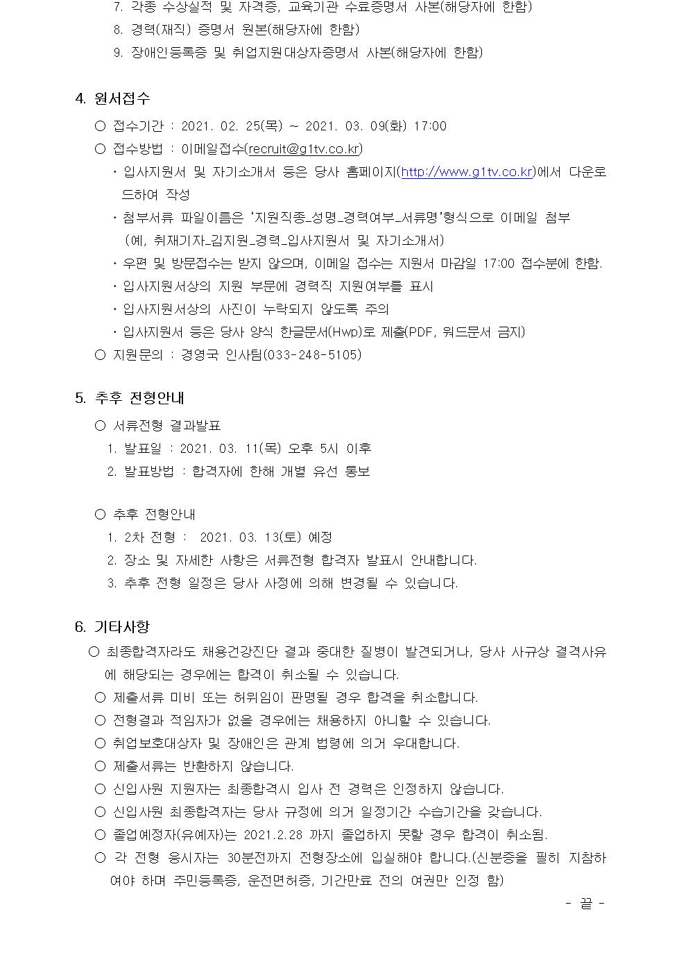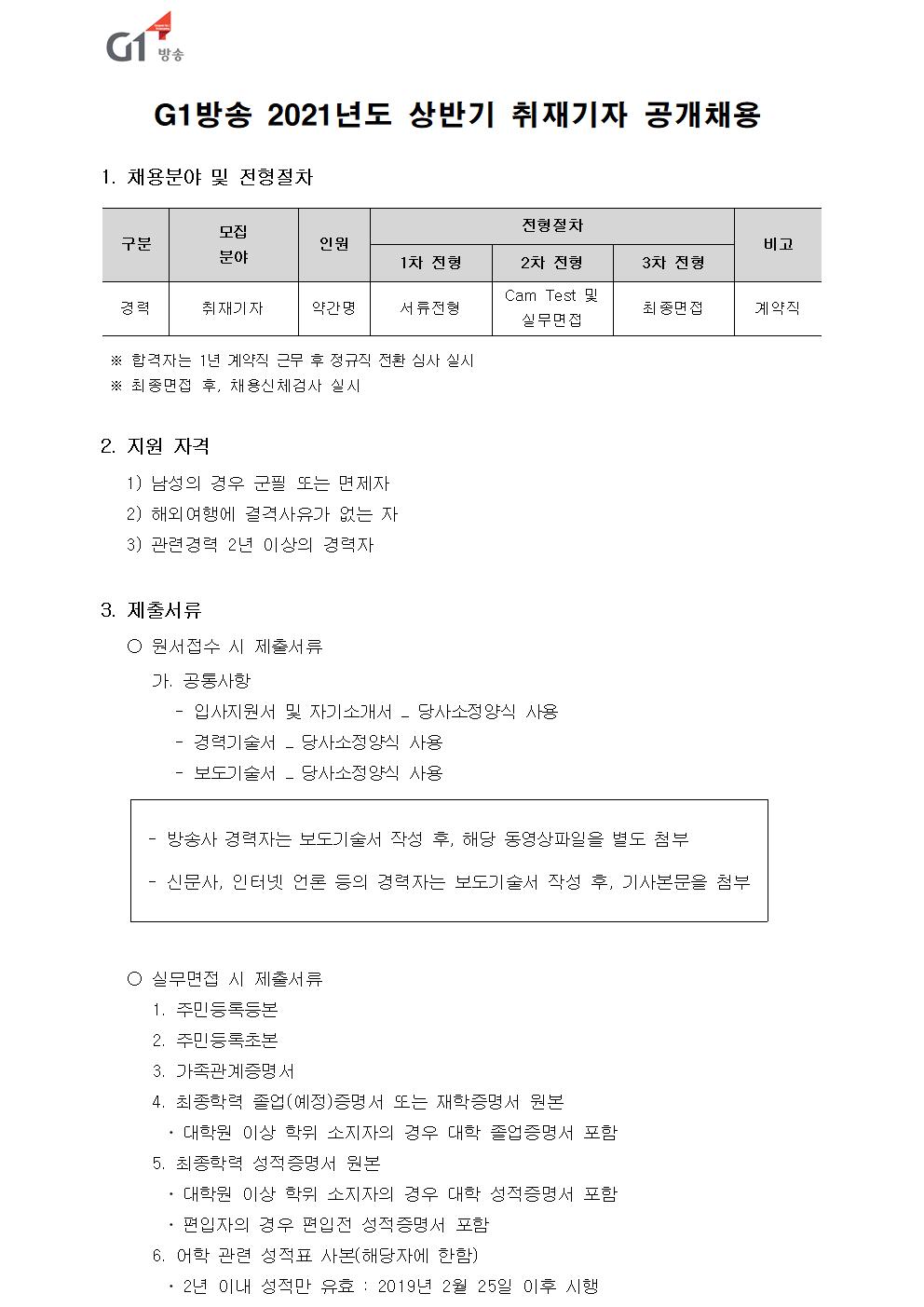 2021년도 상반기 취재기자 공개채용 작성자 :관리자 등록일 :2021-02-25 조회수 :3,146 2021년도 상반기 취재기자 공개채용 - 모집요강.pdf (94.37KB)★2021 G1 입사지원서 및 자기소개서.hwp (137.50KB)★2021 G1 보도기술서.hwp (21.50KB)★2021 G1 경력기술서.hwp (21.50KB) 이전글2021년도 하반기 공개채용2021-08-27다음글2020년도 하반기 G1 방송기술직 공개채용2020-11-20 목록