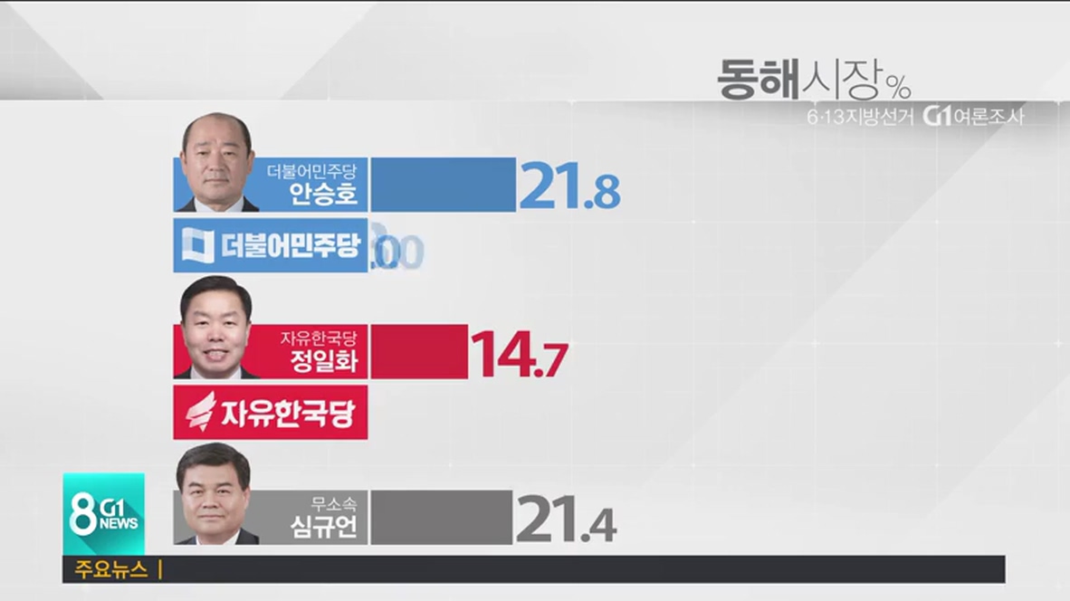 /동해의 경우 후보 지지도는 민주당 안승호 후보 21.8%, 한국당 정일화 후보 14.7%인 반면,