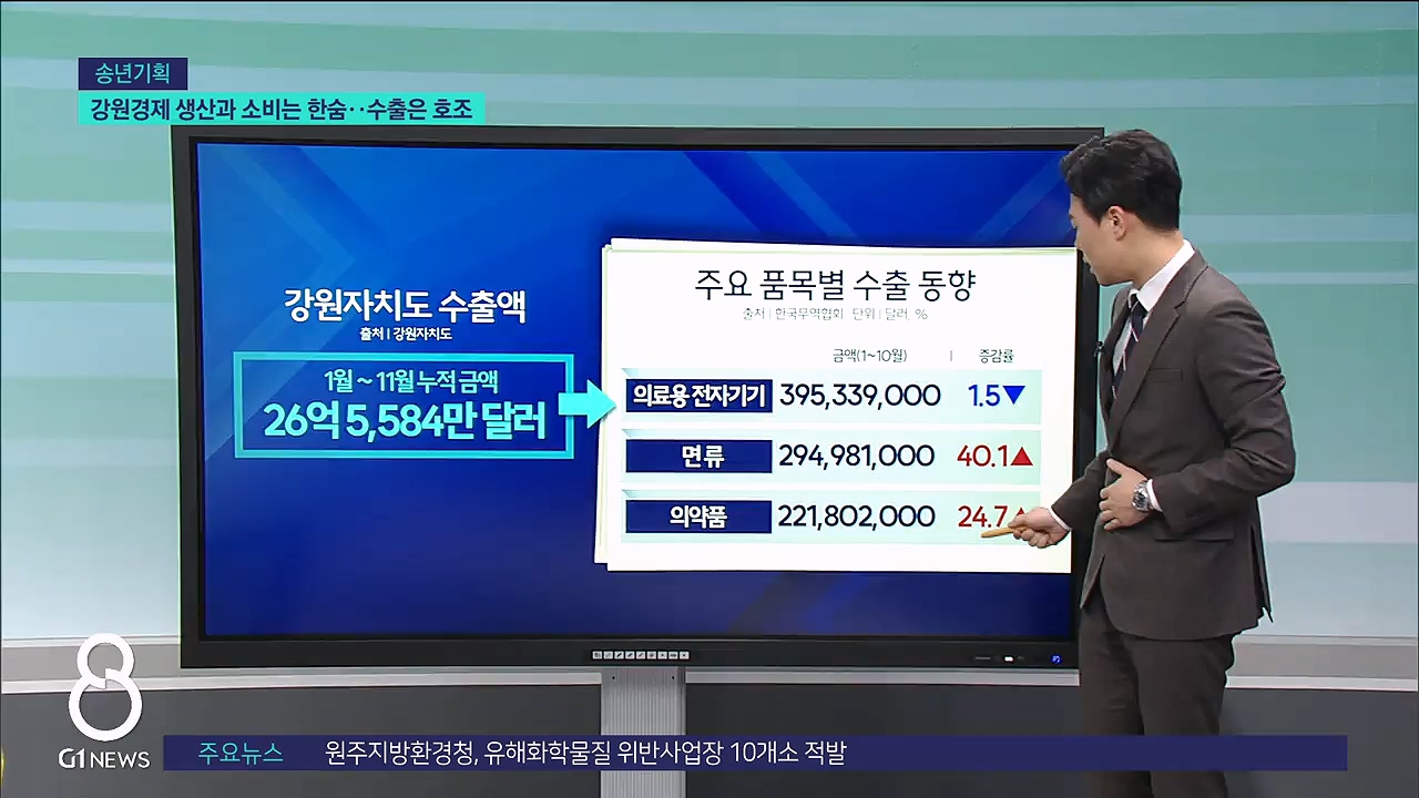 올 11월까지 강원의 누적 수출액은 지난해 같은 기간보다 7.2% 증가한, 26억 5천584만 달러로 역대 최고치를 찍었습니다.