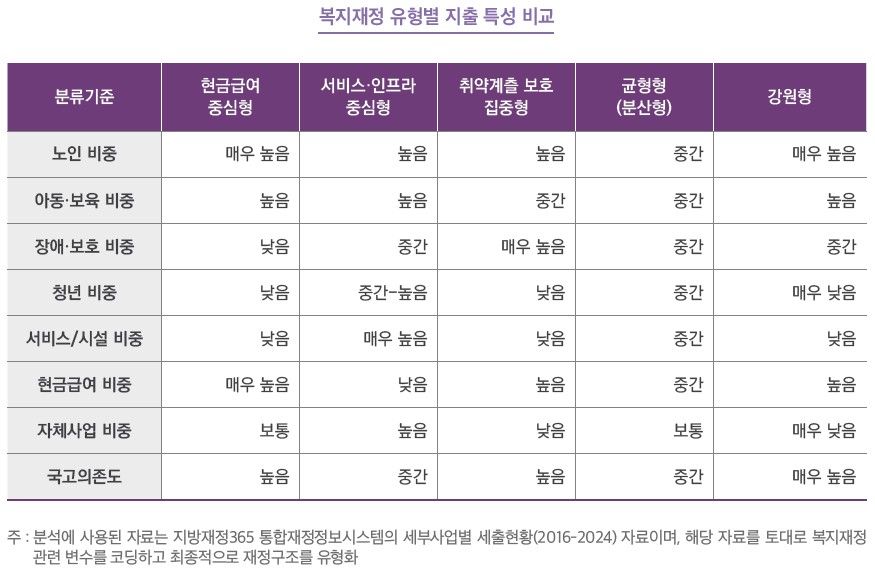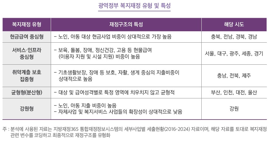 이는 각 광역정부의 지출구조 특성과 재정 투입의 방향성을 의미하는데, 주요 유형은 1.현금급여 중심형, 2.서비스.인프라 중심형, 3.취약계층 보호 집중형, 4.균형형(혹은 분산형)이다.