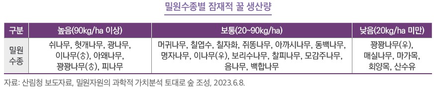 ha당 잠재 꿀 생산량이 90kg 이상이어서, 아까시 나무가 평균 38kg인 점을 감안하면 2배 이상 높은 수준의 생산량을 기대할 수 있다.