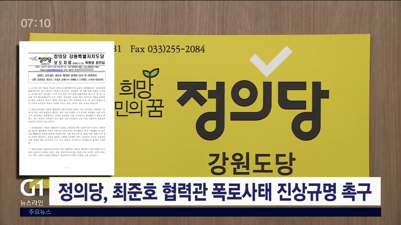 정의당 강원자치도당이 '교직원 선거 개입' 의혹을 폭로한 최준호 협력관에 대한 진상규명을 촉구했습니다.