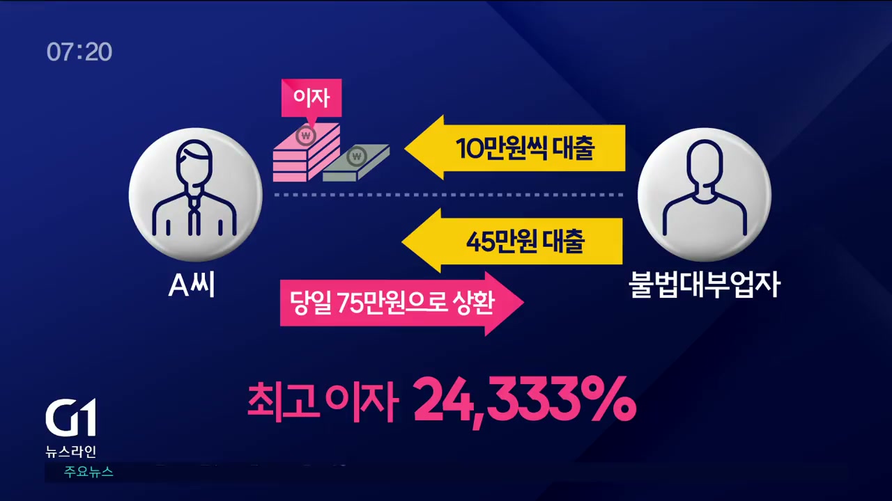 이런 수법으로 법정이자율인 연 20%를 훌쩍 넘긴 최고 2만 4천% 이상의 이자를 부과했다는 게 경찰의 설명입니다.
