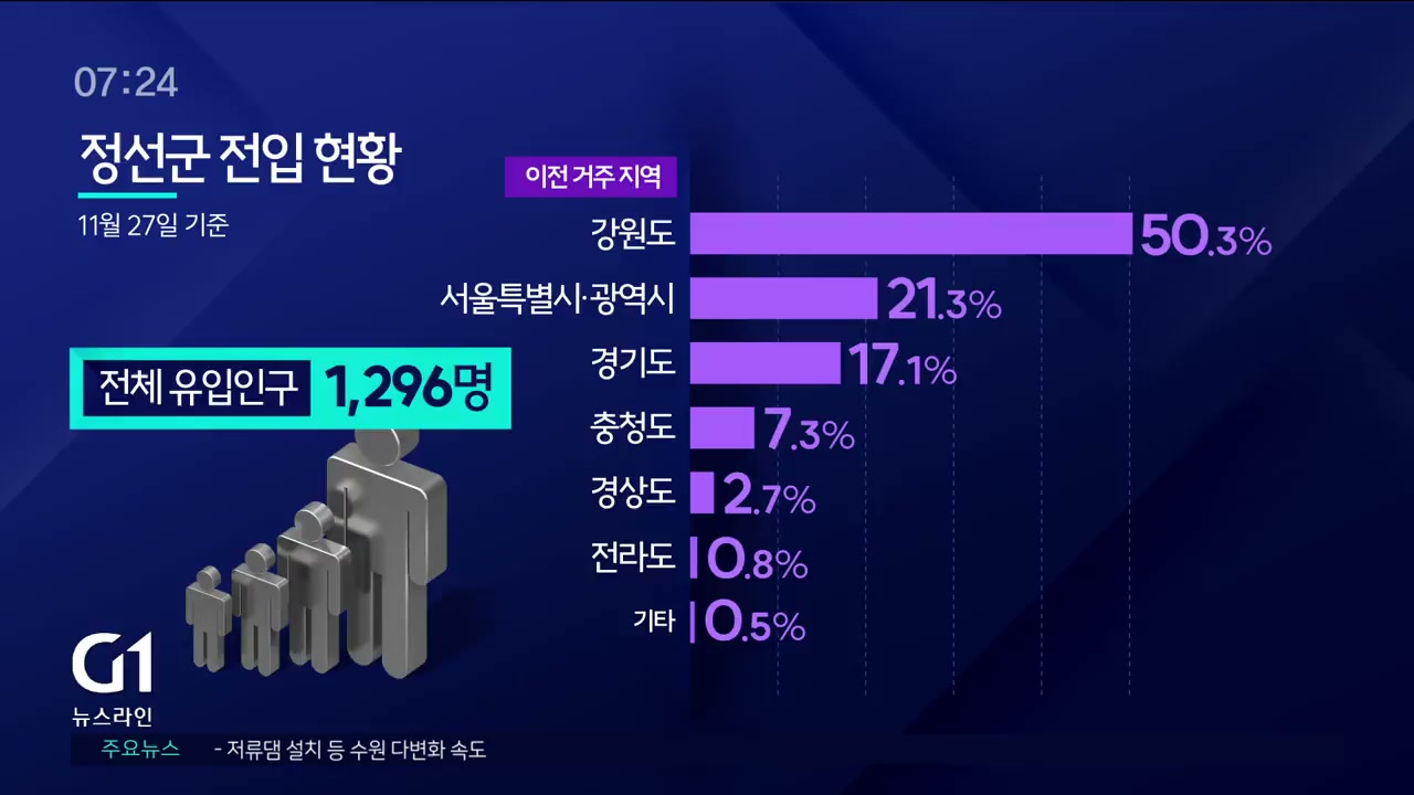 /지난달 27일 기준 정선군으로 유입된 인구는 1,296명.
