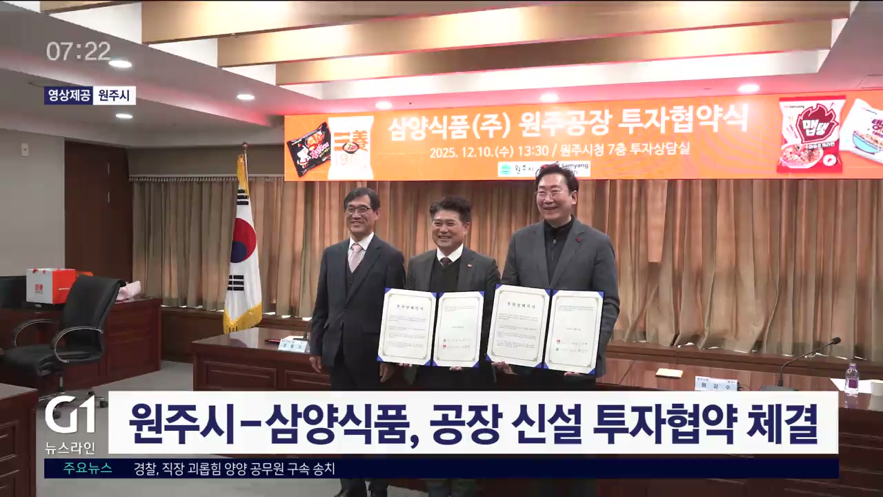 원주시는 어제(10일) 원주시청 투자상담실에서 삼양식품과 액상스프 공장 신설 투자를 위한 협약식을 가졌습니다.