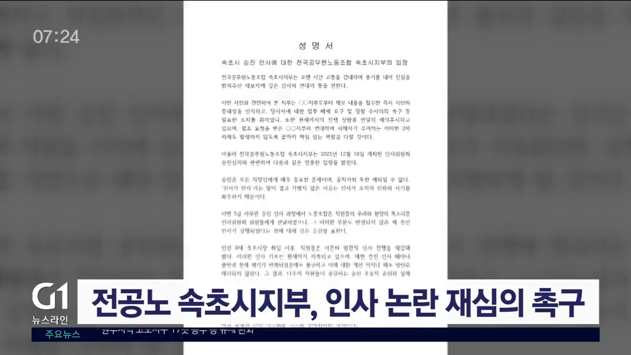 성 비위 의혹 등으로 불거진 속초시 승진 인사 논란과 관련해 전국공무원노조 속초시지부가 재심의를 촉구했습니다.