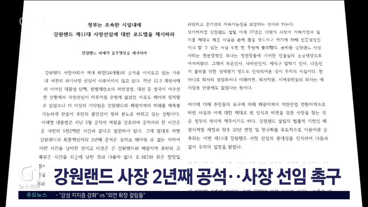 석탄산업 전환지역 주민들이 정부에 2년째 공석인 강원랜드 사장 선임에 대한 로드맵을 마련하라고 촉구했습니다.