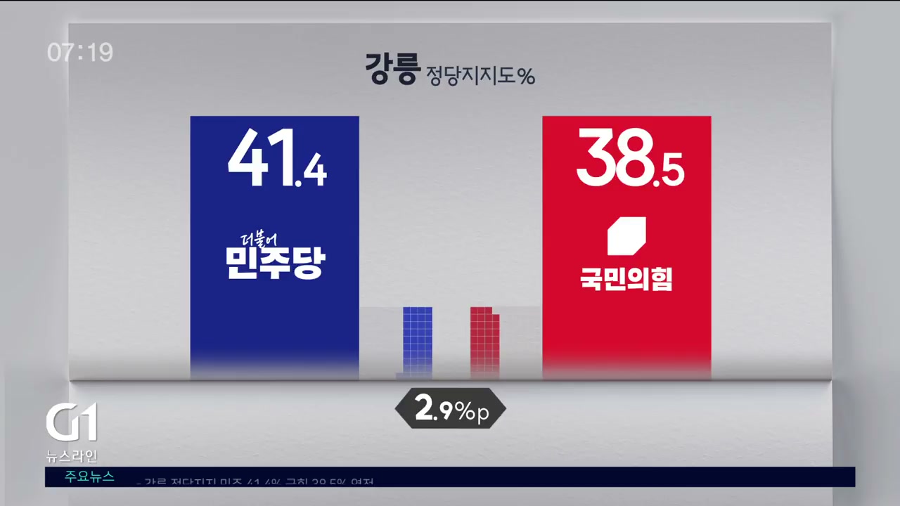/강릉 지역 정당 지지도는 오차범위 안이긴 해도 민주당이 우세했습니다.