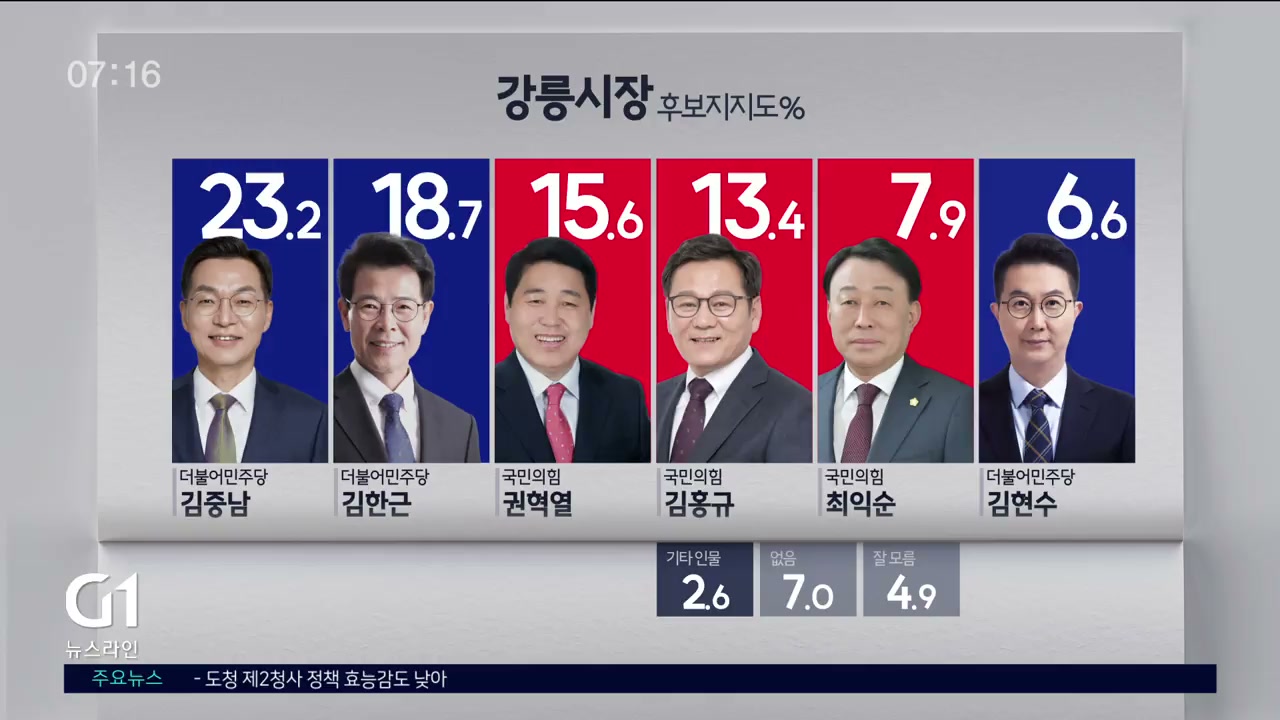 이어 같은당 김한근 전 강릉시장 18.7%, 국민의힘 권혁열 전 강원도의장 15.6%, 김홍규 현 강릉시장 13.4%, 최익순 강릉시의장 7.9%, 민주당 김현수 강릉시의회 운영위원장 6.6% 순이었습니다.