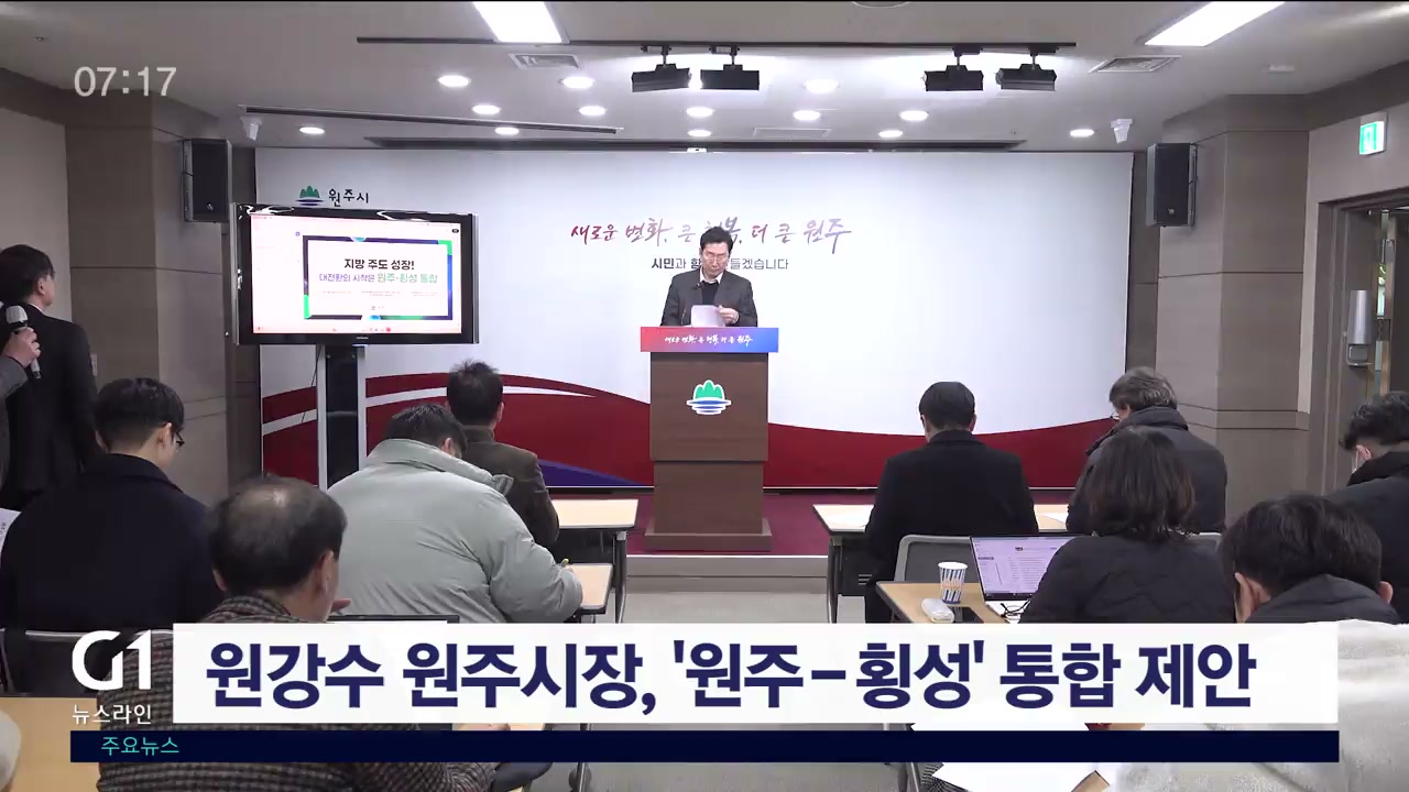 원강수 원주시장이 어제(26일) 시청에서 긴급 브리핑을 열고 원주시와 횡성군의 통합을 제안했습니다.