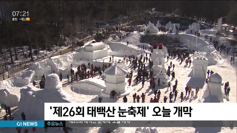올해로 26회째를 맞는 이번 축제에서는 길이 50m, 높이 8m에 달하는 초대형 눈조각을 비롯해 대형 눈조각 27점이 시내 곳곳에 전시되며, 태백산 눈꽃 산행 등을 즐길 수 있습니다.