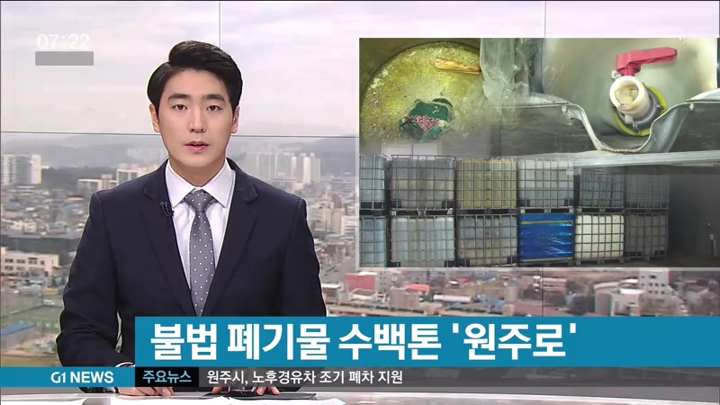 지난 21일 밤 화학 폐기물 등을 실은 트럭 수십대가 원주의 한 창고건물에 폐기물 수백톤을 불법으로 적치하려다 적발됐습니다.