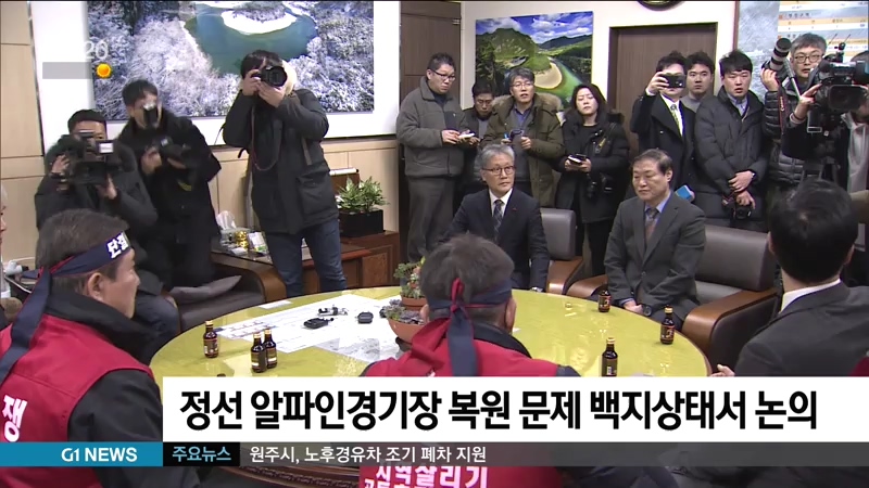 어제 김재현 산림청장과 '정선 알파인경기장 철거 반대 범군민투쟁위원회'는 오는 31일까지 국무조정실에서 이해 관계자가 참여하는 사회적 합의 기구를 만들어 회의를 개최하기로 합의했습니다.