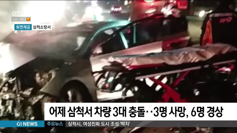 어제(24일) 오후 8시 10분쯤 삼척시 오분동 국도 7호선에서 카니발 승용차와 덤프트럭, 택시 등 차량 3대가 잇따라 충돌했습니다.