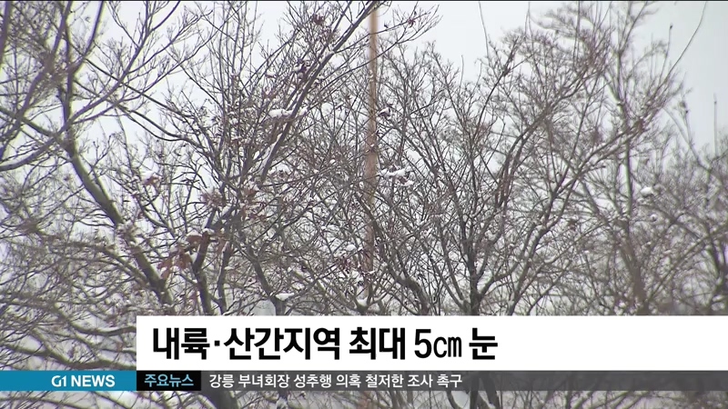 예상 적설량은 중북부 산지에 2~5cm, 내륙과 남부 산지에는 1~3cm가 예상됩니다.