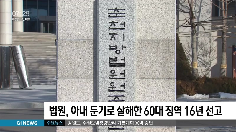 춘천지법 원주지원은 지난해 7월 집 마당에서 귀가 후 차에서 내리는 아내를 둔기로 때려 살해한 혐의로 기소된 69살 A씨에게 징역 16년을 선고했습니다.