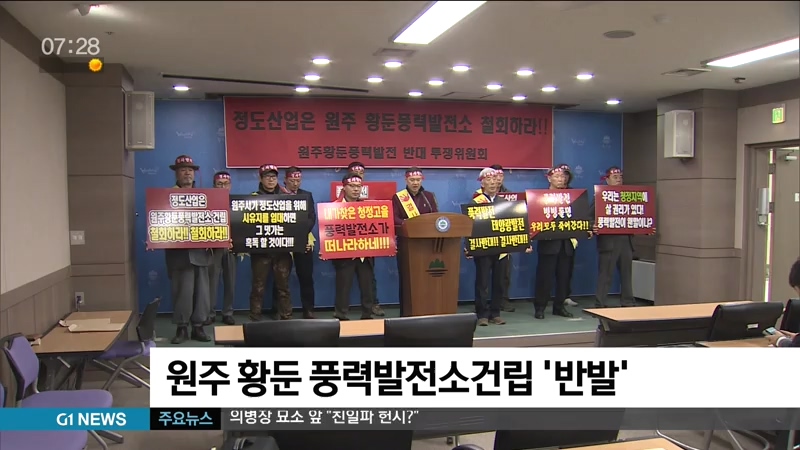 원주시 신림면과 영월군 무릉도원면, 충북 제천시 송악면 지역 주민들로 구성된 '원주 황둔 풍력발전소건립저지 투쟁위원회'는 어제 원주시청 브리핑룸에서 기자회견을 열고, 산업자원부에 풍력발전사업 허가 철회를 촉구했습니다.