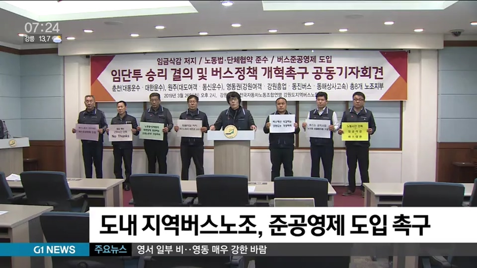 춘천과 원주, 영동지역의 버스노조는 근로기준법 개정에 따른 주 52시간 근무제로 근로자들의 연장근무가 불가능해져 생존이 위협받고 있다며 버스 준공영제 도입을 촉구했습니다.