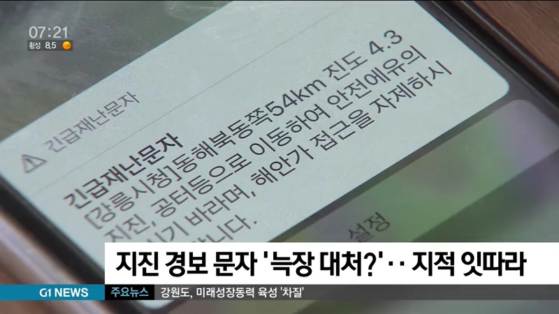 한편, 강릉시는 이번 지진이 발생한지 21분 만인 오전 11시 37분에, 동해시는 39분만인 오전 11시 54분에 자체 판단으로 주민들에게 각각 재난 문자를 발송했습니다.