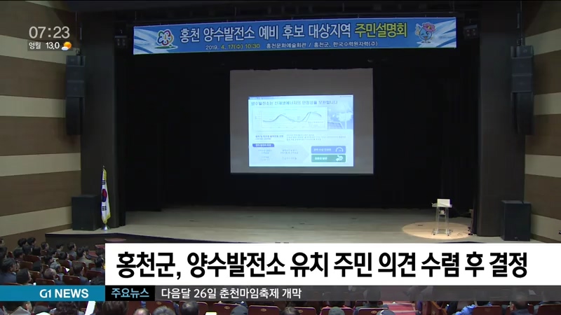 홍천군은 양수발전소 발전기를 기준으로 반경 5km 이내 포함되는 구성포 2리와 풍천1,2리, 야시대2리 주민들을 대상으로 다음달 10일까지 의견 수렴 절차를 거쳐 발전소 유치 신청 여부를 최종 결정하겠다고 밝혔습니다.