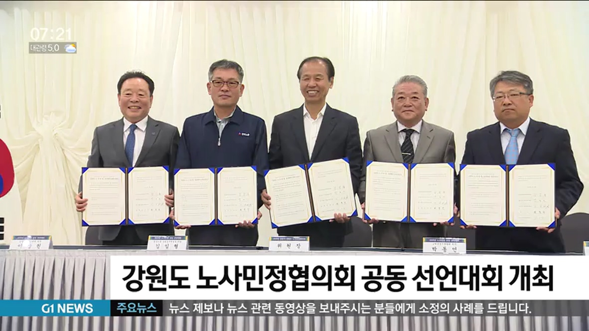 강원도 노사민정협의회는 서로 협력해 이모빌리티 강원도형 일자리 모델 발굴과 강원상품권 사용 확대, 일자리 안심공제 활성화와 지속가능한 고용 유지 환경 조성 등의 내용이 담긴 공동 선언을 선포했습니다.