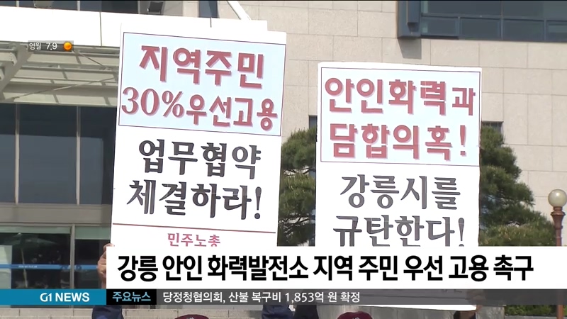 이어 "강릉시는 발전소 측과 지역 주민 우선 고용을 위한 협약 맺기를 촉구한다"며 "앞으로 시청 앞에서 집회를 갖고 문제 해결을 위해 투쟁할 것"이라고 밝혔습니다.