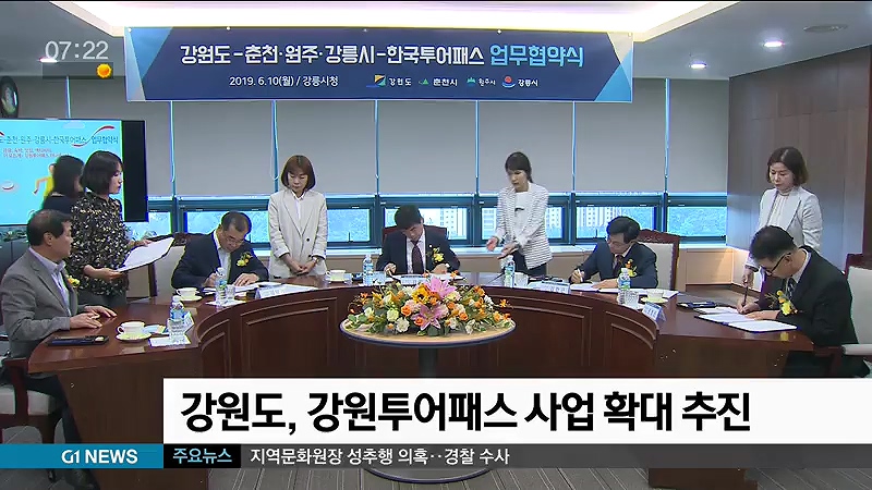 강원도는 어제(10일) 강릉시청에서 한국투어패스와 춘천, 원주, 강릉 등 3개 도시와 '강원투어패스'추진을 위한 업무 협약을 맺었습니다.