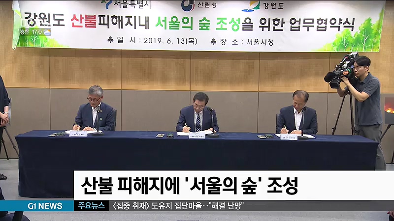 강원도와 서울시, 산림청은 서울시청에서 산불 피해지의 신속한 복구와 지역경제 활성화를 위한 '서울의 숲' 조성 업무협약을 체결했습니다.