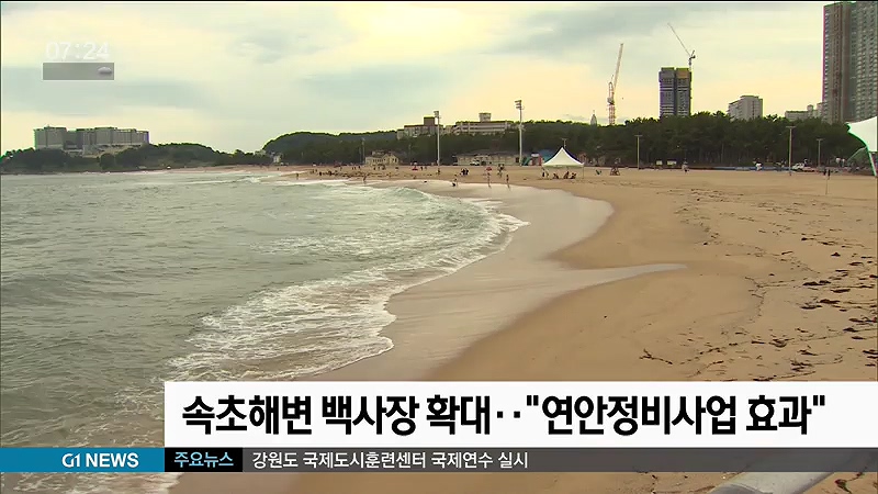 속초시에 따르면, 해마다 침식이 반복되던 속초해수욕장은 2015년 연안정비 사업 이후 북쪽 해수욕장 백사장이 2017년 5월 56m에서 80m로 넓어졌습니다.