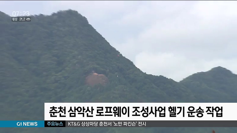 춘천시에 따르면, 어제 로프웨이 상부정차장이 조성될 해발 450m 높이의 삼악산 중턱에 정차장 공사를 위한 자재를 헬기로 운송하는 작업을 했습니다.