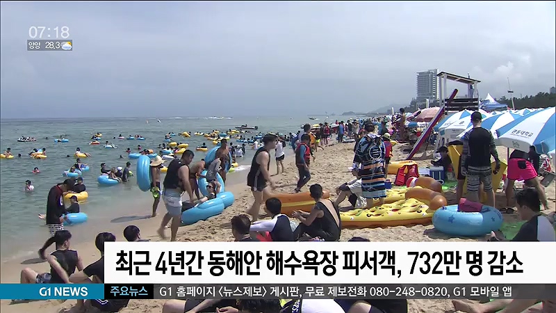 강원도 환동해본부에 따르면, 동해안 해수욕장 을 찾은 피서객은 지난 2015년 2천 578만 명에서 이듬해 2천 477만 명, 지난해에는 천 846만 명으로, 최근 4년 사이 732만 명이 줄었습니다.