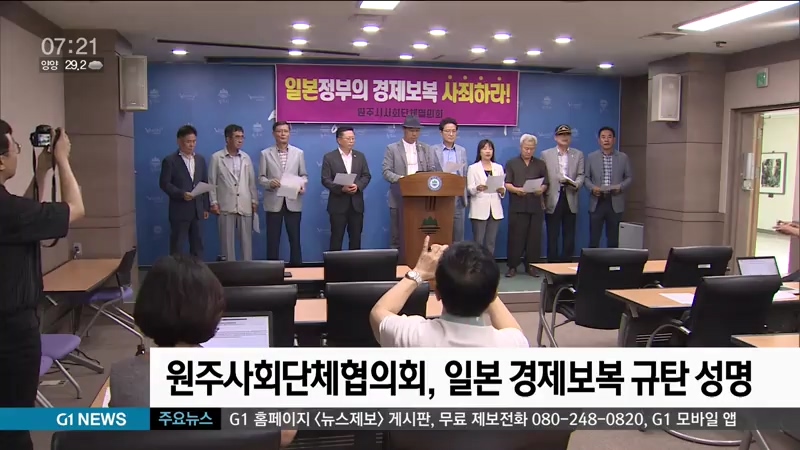 원주시 사회단체협의회는 어제(29일), 원주시청 브리핑룸에서 일본 정부의 경제보복 조치를 규탄하는 성명서를 발표했습니다.