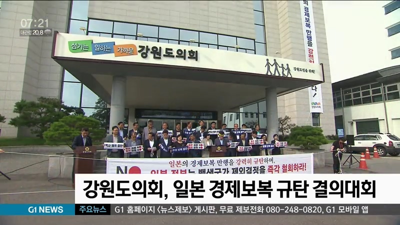 강원도의회는 어제(6일) 의회 앞에서 도의원들이 참석한 가운데 한국을 수출우대국가 '화이트리스트'에서 제외한 일본의 결정을 즉각 철회할 것을 촉구하는 결의대회를 개최했습니다.