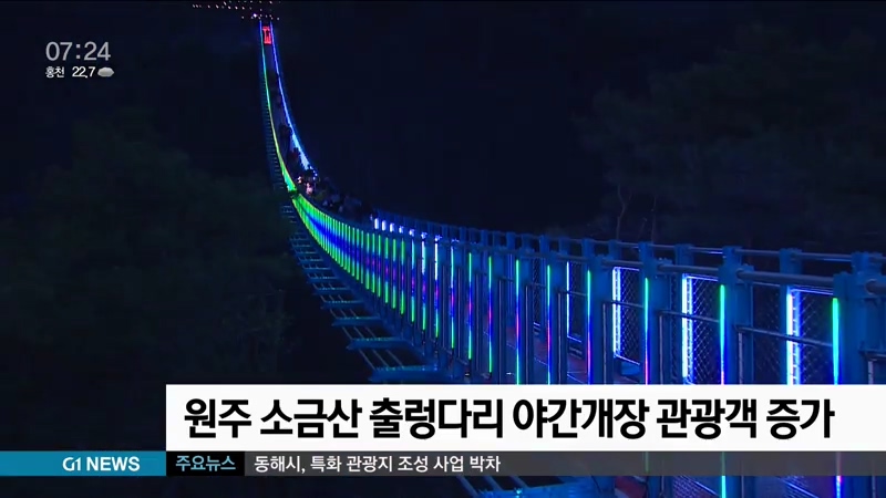 원주시는 지난 7월 27일부터 8월 10일까지 소금산 출렁다리와 하늘바람길을 야간 개장한 결과, 하루 평균 511명이 방문해 총 7,000여명이 다녀갔다고 밝혔습니다.