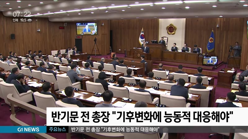 강원도의회 개원 63주년 기념 초청연설자로 나선 반 전 총장은 "이미 전 세계적으로 기후변화 현상이 가속화되고 있고, 강원도에서도 해변 침식이 증가하고 수온 변화로 어종이 변하고 있다"며, "기후변화에 선제적이고 적극적으로 접근해야 한다"고 강조했습니다.