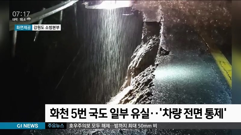 경찰은 어제 오후 6시 25분쯤 , 화천군 하남면 서오지리 5번 국도 1개 차선이 유실돼 차량 통행을 전면 통제하고, 우회 조치하고 있다고 밝혔습니다.