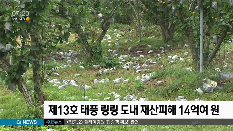 지난8일 발생한 제13호 태풍 링링의 영향으로 도내에서 발생한 재산피해는 14억여 원 인 것으로 집계됐습니다.
