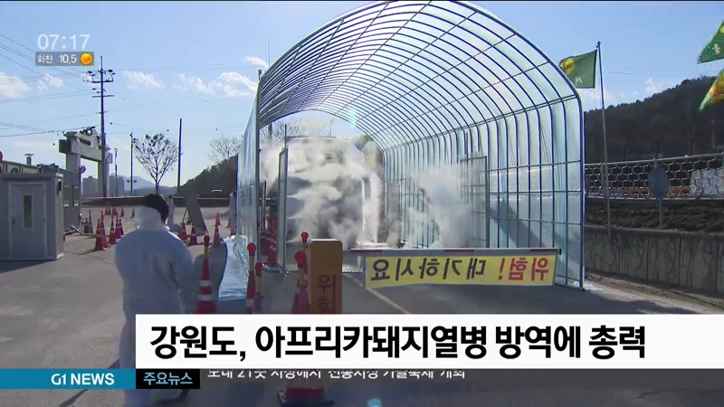 강원도는 아프리카돼지열병에 대한 위기경보가 '심각' 단계로 격상된 이후, 예비비 23억 3천만 원을 투입해 경기도와 인접한 시, 군에 통제초소와 거점 소독시설을 확대 운영하기로 했습니다.