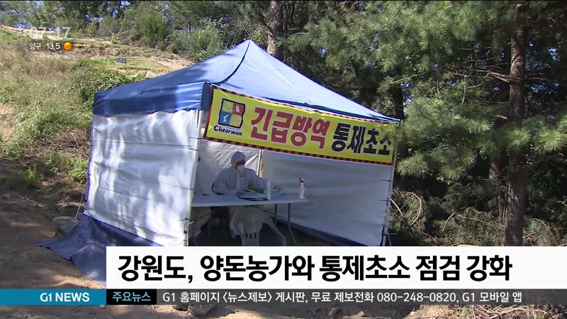 강원도는 2인 1조로 5개팀을 꾸려 중점관리지역인 철원의 모든 양돈농가와 양양 돈사 밀집지역 등에 설치된 통제초소에 대해 매일 순회 점검을 벌인다고 밝혔습니다.