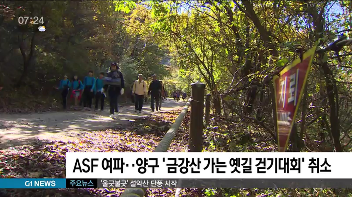 아프리카 돼지열병의 여파로 양구군 두타연 일대에서 10월 10일부터 사흘간 열릴 예정이었던 '금강산 가는 옛길 걷기대회'가 취소됐습니다.