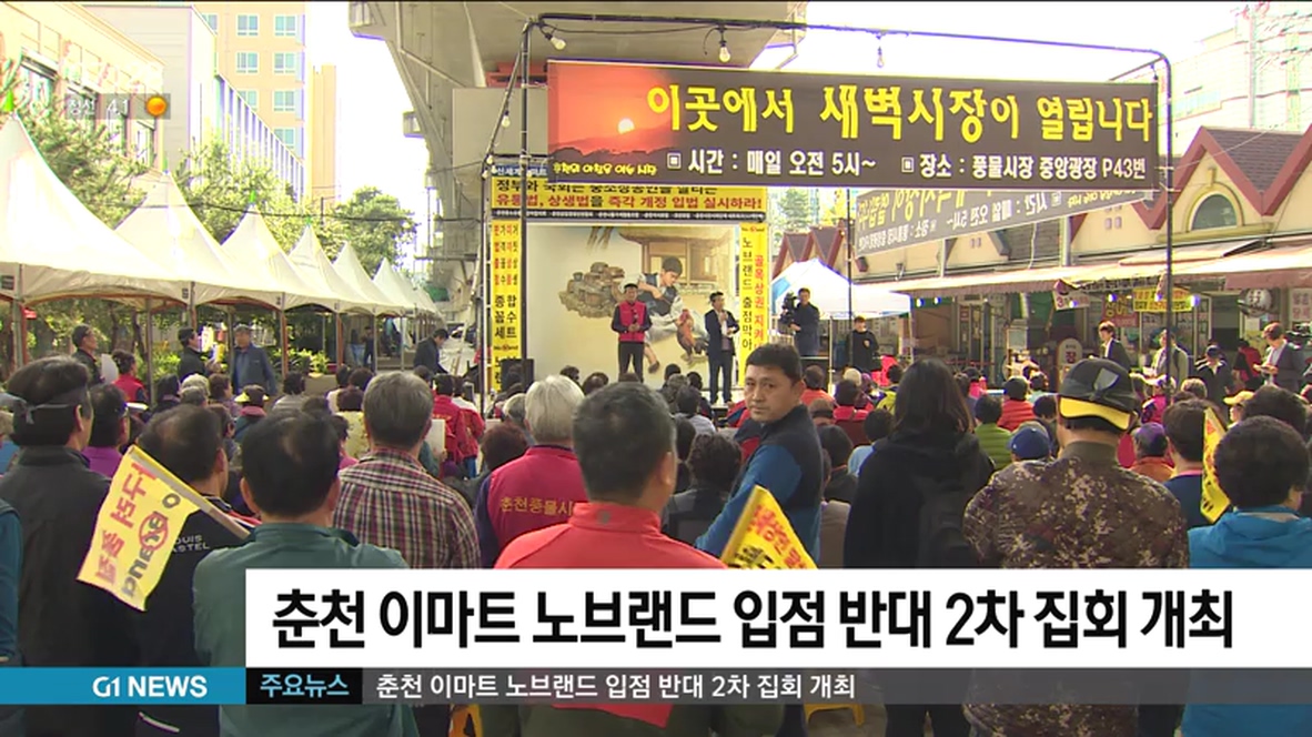 춘천의 상인회와 시민단체 18곳이 오늘(8일), 춘천시 풍물시장에서 기업형 수퍼마켓인 이마트 노브랜드 입점을 반대하는 2차 궐기대회를 열었습니다.