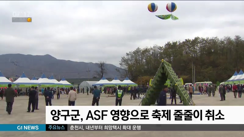 아프리카돼지열병의 여파로 양구군이 DMZ 펀치볼 시래기축제와 양구 사과축제의 개최를 취소했습니다.