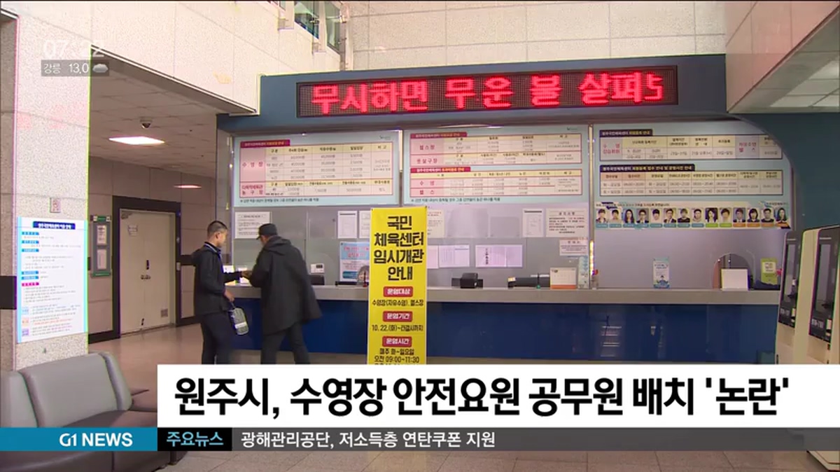 원주시 공무직노조는 기자회견을 통해, "원주시는 국민체육센터 수영장을 개장하기 위해, 공무원 15명에게 18시간 교육을 거쳐 수상안전요원 자격증을 받게한 뒤, 안전요원으로 투입했다"며, 이는 시민들의 안전과 목숨을 담보로 도박을 하는 것과 마찬가지라고 비난했습니다.