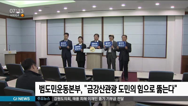 금강산관광재개 범강원도민운동본부는 어제, 강원도청에서 긴급 기자회견을 갖고, "지금 우리는 분단과 대결의 시대로 돌아가느냐, 화합과 평화의 시대를 열어가느냐는 갈림길에 서 있다"며, "평화를 우리 스스로 만들어 나가겠다"고 밝혔습니다.