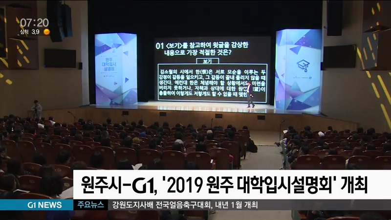 원주시와 G1 강원민방이 주최한 오늘 설명회는 예비 고3과 고2 학생들을 대상으로, 겨울방학 학습법과 2021 대입 제도 분석 등에 대해 입시 전문가들의 강의로 진행됐습니다.